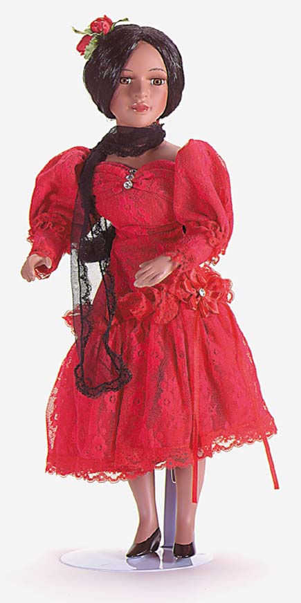 Item No. ASC133 With Spanish eyes flashing, "Carmen" appears dressed in red with a dramatic black scarf. Porcelain. 16" tall. $44.95