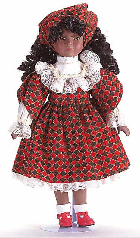 Item No. ASC134 "Jasmine" is ready for an afternoon tea in her colorful dress with white lace collar, cuffs and trim. Porcelain. 16" tall. $44.95
