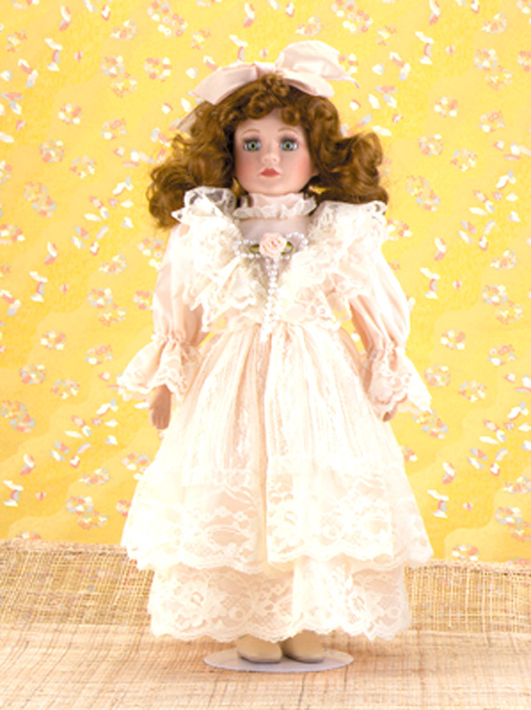 Item No. ASC159 "Lily." No lovelier bloom ever blossomed than this Lily of the Valley, with soft green eyes and a soft peach lace dress. 16" tall. $44.95