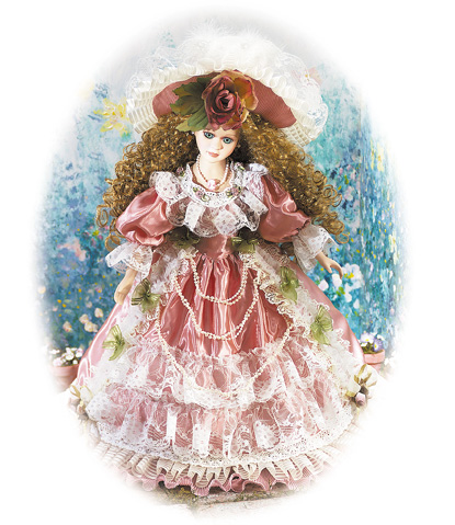 Item No. AC630 "Desiree", wears a pink sateen outfit with lace ruffles and faux pearls. A faux pearl and simulated cameo complete the ensemble. The Anastasia Collection. 18" high. $54.95