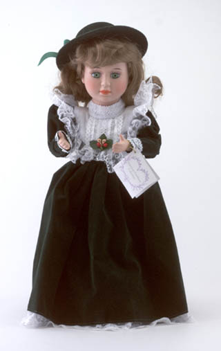 Item No. ASC559 "Claire." This young lady in her elegant lace and deep green velveteen is also a musical doll with movement! She'll bring you holiday cheer with the tunes, "Jingle Bells," "We Wish You A Merry Christmas," and "Santa Claus Is Coming To Town." 16" tall. $57.95
