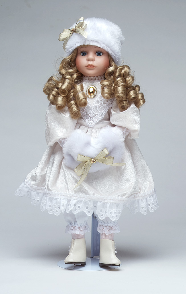Item No. ASC081 Beautiful "Isabel" is a Victorian winter dream in her pristine white lace, ribbon-trimmed "fur" and golden brooch. 16" tall. $44.95