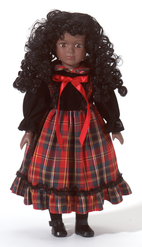 Item No. ASC083 "Sabrina." a very poised young lady who is perfectly dressed for a cool winter's night in her velveteen and plaid. 16" tall. $44.95