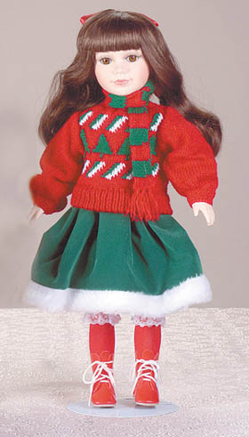 Item No. ASC086 "Noel" is so happy it's Christmas, she's dressed up in her favorite red sweater and green "fur" trimmed velvet skirt! Porcelain. 16" tall. $44.95
